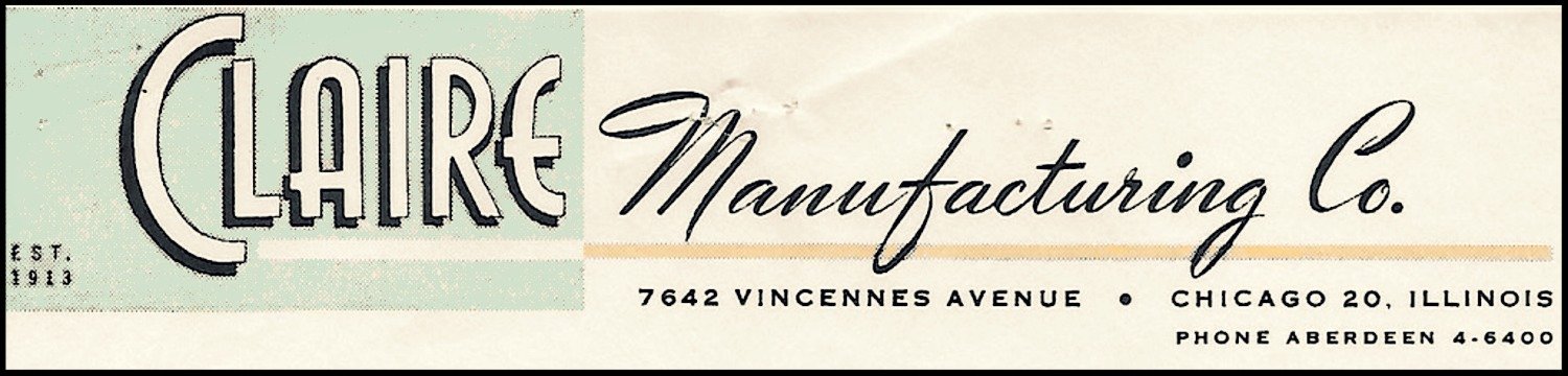 Former company vice president Val Kaspar, who joined Claire MFG in 1967, believes the original 1913 business was backed by more than a dozen investors, and had a storefront location at 6742 S. Yale Avenue in Englewood. The earliest listings I could find—from 1914—put the original headquarters slightly further north at 336 W. 63rd Street, but this was likely the site of the home office, rather than the storefront/factory. The Yale Avenue address begins appearing in Tribune classified ads in the early 1920s and would remain a central base for the company into the 1940s.
