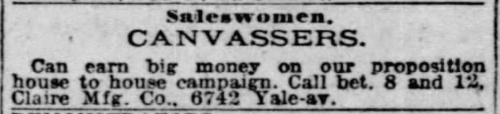 [A 1920 classified ad seeking door-to-door saleswomen to push Claire products. The company address is already listed at 6742 S. Yale Avenue, where Claire would remain for several decades.]