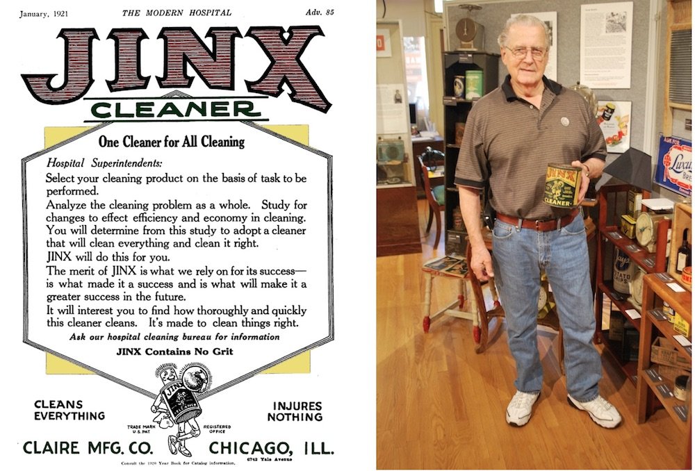 [LEFT: Jinx’s versatility allowed Claire to target a wide range of trade magazines, from automobile journals to medical publications like this 1921 issue of The Modern Hospital. RIGHT: Former Claire vice president Val Kaspar, 79, holds a vintage Jinx can during a visit to the Made In Chicago exhibit at the Edgewater Historical Society in 2018]
