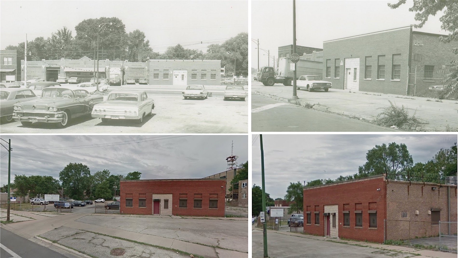 [Above: The former Claire-Sprayway facility at 7640 S. Vincennes Ave., 1965 vs. 2018]