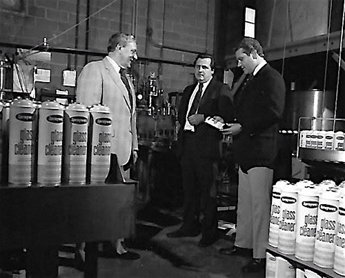 During the 1960s, sales manager Jim Murray helped guide Claire into the sanitary chemical supply trade, while Sprayway expanded into the glass, automotive, silk screen, and graphic arts industries. By the time Val Kaspar became Claire-Sprayway’s vice president in 1970, there were 43 employees at the Vincennes complex, producing 5 million units annually. [pictured below, from left: Jim Murray (VP of Sales), Val Kaspar (VP), and Thomas Ehler (President), c. 1970s]