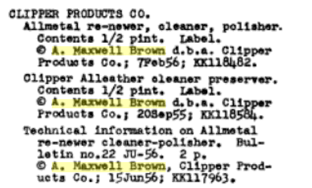 A 1956 Catalog of Copyright Entries does mention “Alleather” and an “Allmetal re-newer, cleaner, polisher” as officially registered properties of the Clipper Products Co. Both copyrights are also credited to a guy named A. Maxwell Brown, “d.b.a Clipper Products Co.”