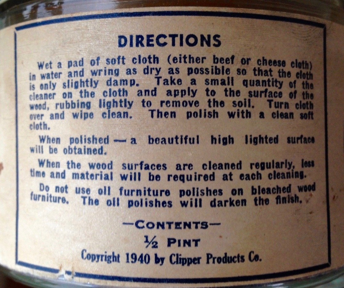 As the label says, Modern Finished Bleached Wood Clipper Cleaner & Polish was a “highly specialized product for all bleached finishes such as Platinum, Blond, Dusty Oak, Lime Oak, Swedish Modern, American Modern, Prima Vera, Toasted Mahogany, and all bleached furniture, wall paneling, metal and wood Venetian blinds. CLIPPER CLEANER and Polish WILL NOT darken the finish as oil polishes do, but will remove the soil and when polished, the wood has a finished wax appearance. …Use MODERN FINISHED BLEACHED WOOD CLIPPER CLEANER and keep the original finish on your furniture as produced by the furniture manufacturers.” —CLIPPER PRODUCTS SALES CO., Chicago.
