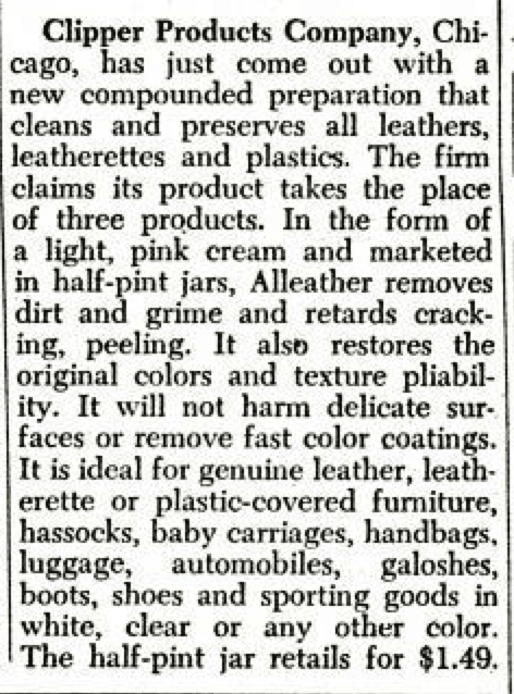 In the 1950s, Clipper Products Co. branched out into more types of cleaning products. The newspaper ad from above, dated to 1954, reveals a similar can to our Clipper Cleaner, but containing “Clipper Chrome & Metal Re-Newer” rather than wood polish. Shortly thereafter, a September 1955 issue of Billboard published the clip below, hyping another as-yet-unnamed Clipper cleaning product in the same type of half-pint jar. This was a “new compounded preparation that cleans and preserves all leathers, leatherettes, and plastics.” We theorize that this product was later marketed as “Alleather,” but the fact we’re unsure speaks to its permanent obscurity.