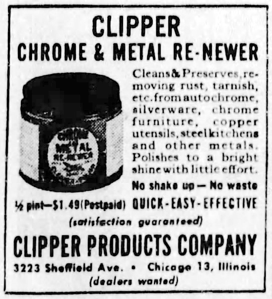 Sounds pretty official, and sure enough, we can at least confirm that Clipper was a real Chicago company, operating from at the least the late 1930s into the late 1950s—a pretty good run. It also appears that the company was headquartered in the same location during that entire span: 3223 N. Sheffield Avenue in Lakeview. That address is now home to a pretty generic, modern apartment building, so the scope of the original factory or warehouse is hard to guess at.