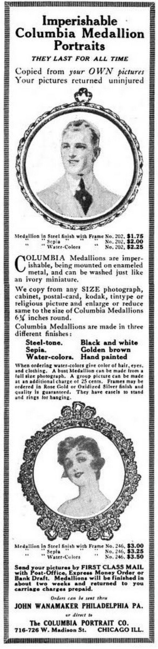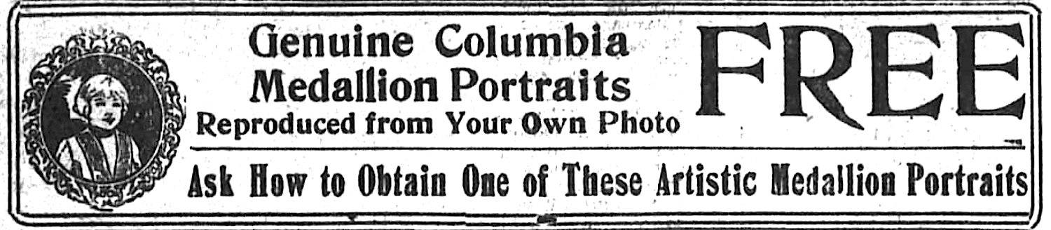 “These beautiful photo medallions are the most artistic portraits ever produced. They are mounted on non-corrosive metal specially prepared. The portrait is burnt in, same as on porcelain, and covered with heavy celluloid, making the picture strong and imperishable, preserving forever the features of those you love.” –Columbia Medallion Studios advertisement, 1913