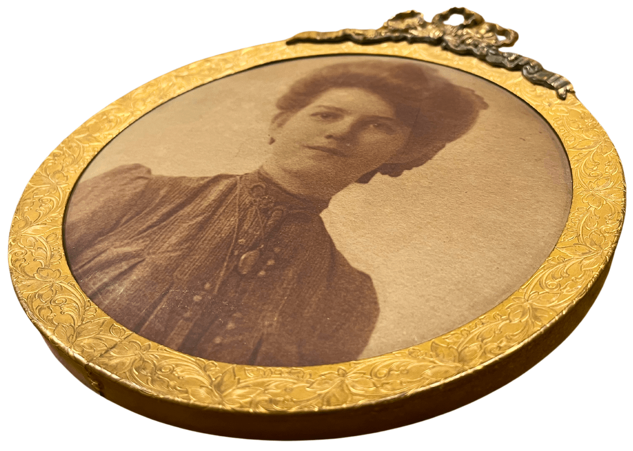 More than 100 years ago, a young woman posed for a professional portrait in a photography studio, and in a flash of light, the camera captured something about her . . . maybe it’s the optimistic eyes of a rebellious suffragette, or the subtle smirk brought on by the comedic stylings of her photographer. In any case, somebody thought enough of the resulting image that they put the original paper photo in an envelope and mailed it to the Chicago offices of the Columbia Medallion Studios, where it was then expertly transferred onto a 6×6″ metal button; given a glazed sepia-tone finish; and finally secured into a stylish, rose gold frame. The young girl had been effectively frozen in time, her essence forever preserved.
