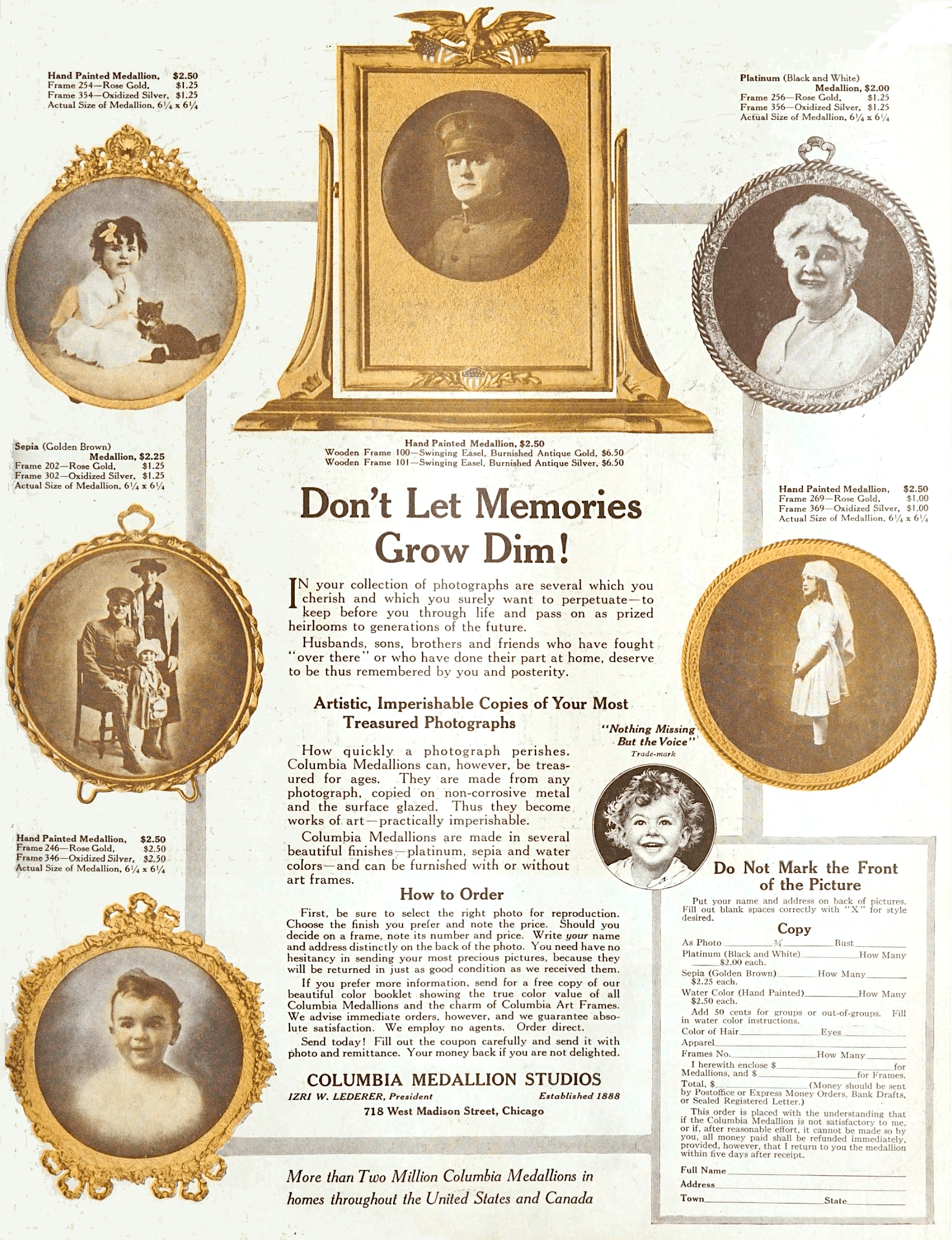 The same rule somewhat applies to the story of the Columbia Medallion Studios itself. While it was supposedly the world’s largest purveyor of photo medallions for the better part of three decades, the company did little to ensure its own lasting relevance, as–like a faded photo–it, too, drifted into obscurity by the 1930s. We’ve compiled what we do know about the business into a short history, which you can find right beneath this full-color 1919 Columbia advertisement.
