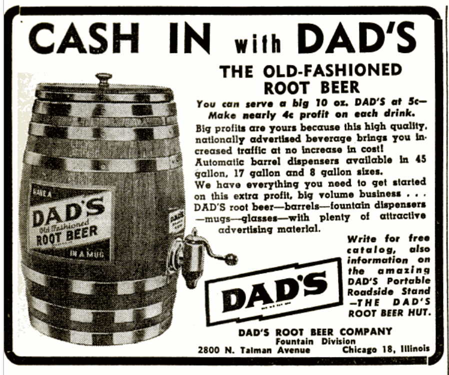 [In this 1950 advertisement, Dad’s offers its own barrel dispensers and other accessories to vendors. The company was also one of the few in the industry to sell its sirup concentrate direct to fountain operators]