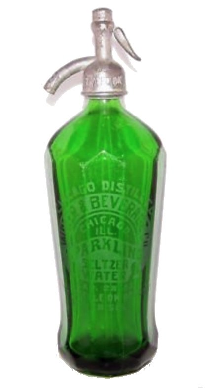 [pictured: Chicago Distilled Water & Beverage Co. “Sparkling Seltzer Water” bottle from the 1930s]