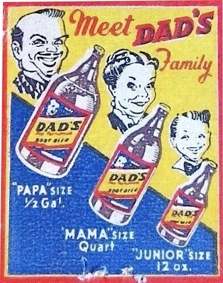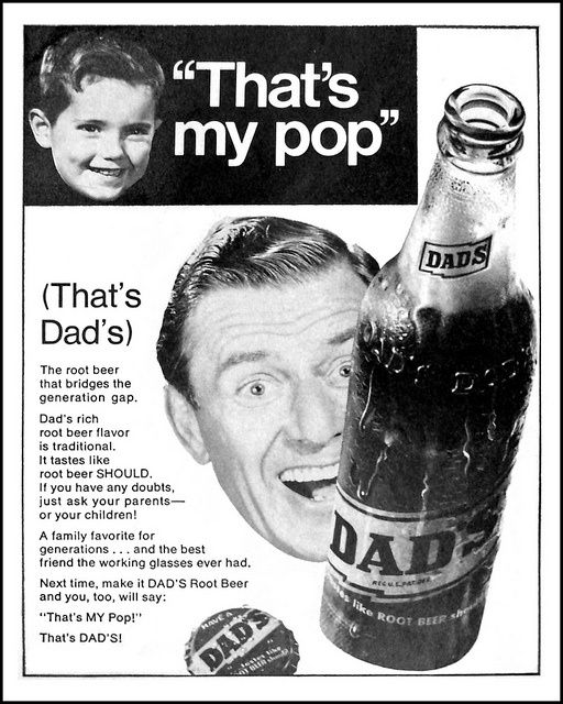“The root beer that bridges the generation gap. Dad’s rich root beer flavor is traditional. It tastes like root beer SHOULD. If you have any doubts, just ask your parents—or your children! A family favorite for generations . . . and the best friend the working glasses ever had. Next time, make it DAD’S Root Beer and you, too, will say: ‘That’s MY Pop!’ That’s DAD’S!”—1969 Dad’s advertisement
