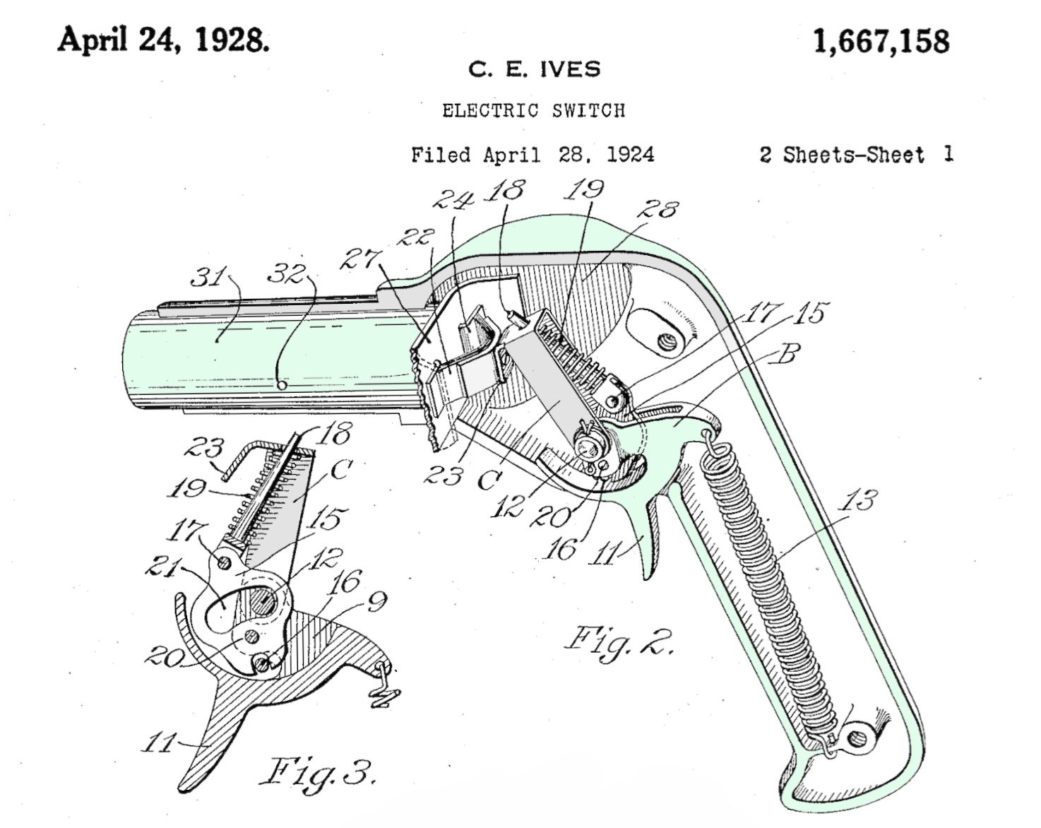 [A patent for a pistol-style electric switch from early in Clifford Ives’s career, 1928]