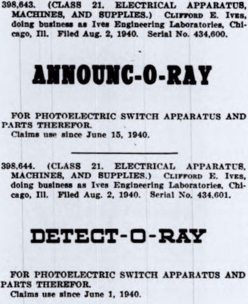 Even before the war, photocells were already being used to track cars on U.S. highways and the output of various machines in factories. Our Detect-O-Ray came along with the second wave of photocells, as the earliest version hit the market around 1940. It was trademarked by a 46 year-old, Chicago-based mechanical engineer named Clifford E. Ives, who had just enjoyed a major career breakthrough as the inventor of the Ives-Way Can Sealer in 1939.