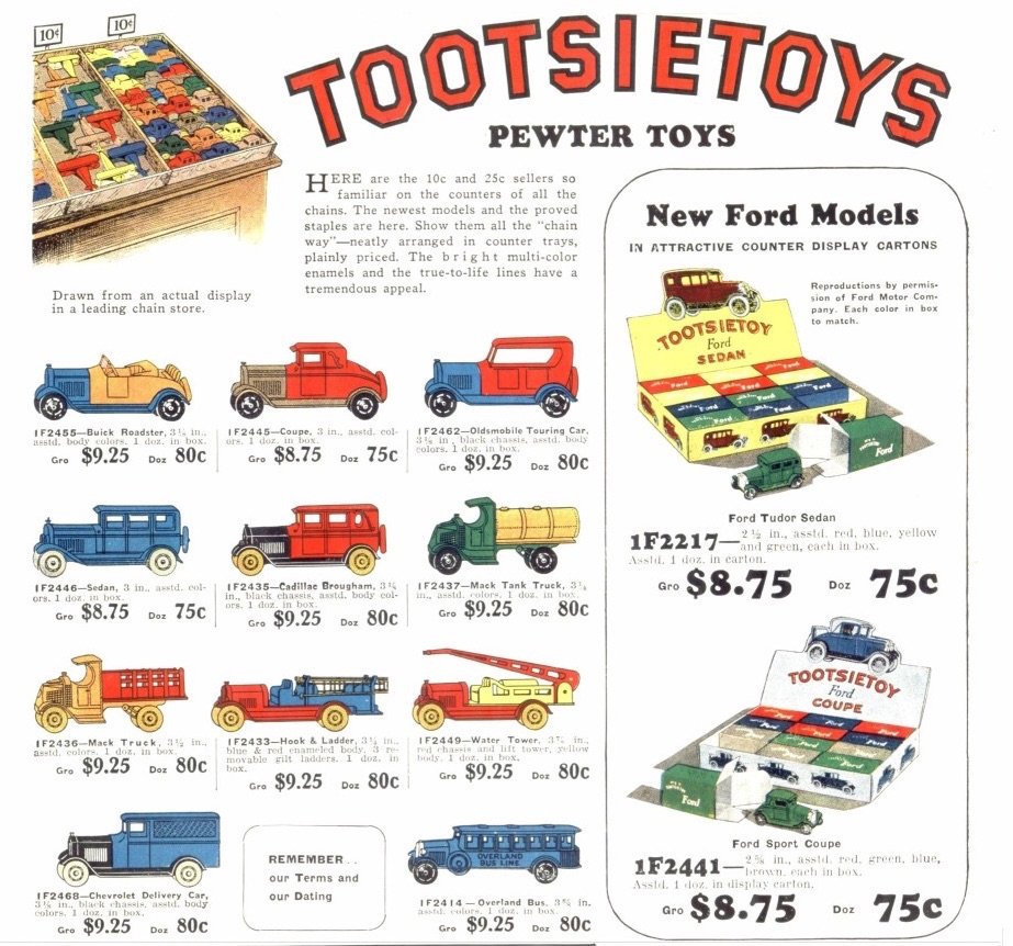It was Theodore Dowst’s own daughter Catherine, aka “Toots,” who supposedly inspired the use of the name “TootsieToy” for the company’s early pewter dollhouse furniture sets (Catherine was an illegitimate child, the result of Teddy canoodling with a Dowst Company secretary, but that’s neither here nor there).