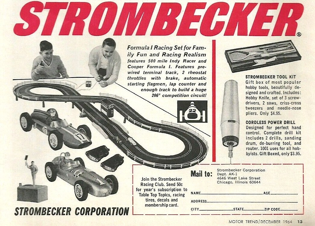 [1964 advertisement for Strombecker slot cars. The Dowst MFG Co. acquired the Strombecker properties and became the Strombecker Corp. in 1961]