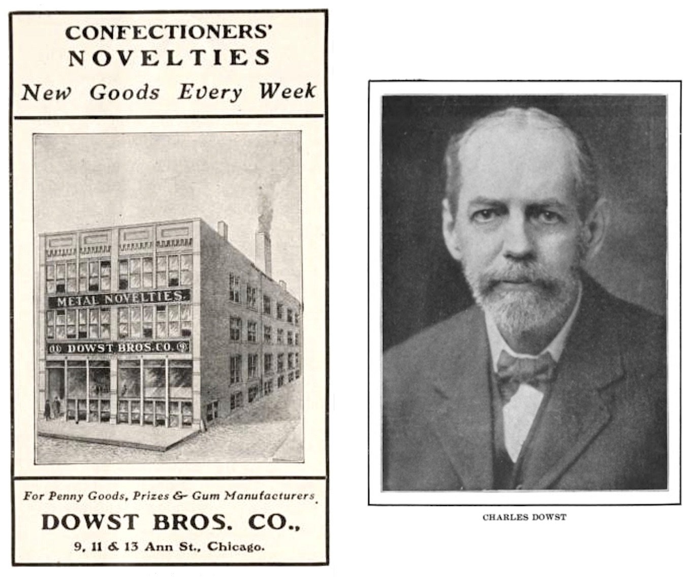 By the dawn of the 20th century, the manufacturing of “metal novelties” was now the Dowst Brothers’ central moneymaker, as they offered their Linotype services to confectioners, penny arcades, and the like. A factory at 9 Ann Street (on the location now known as 120 N. Racine Ave.) was devoted to this work, and Samuel’s son, the aforementioned Theodore, was hired to help keep the books.