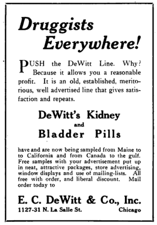 DeWitt’s first patent medicine company had been a partnership with another former Dakota druggist named Charles W. Beggs. But in Chicago, the Biggs & DeWitt firm quickly was scrapped, and E.C. DeWitt & Co. was born.