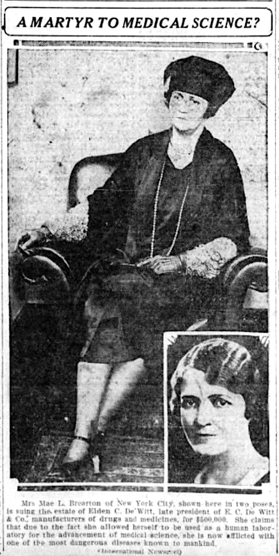 In perhaps the most bizarre, quintessentially Roaring ‘20s court case ever committed to the public record, a woman named Mae Brearton sued the estate of the late Mr. DeWitt for recurring payments never received. Her claim? Years earlier, she had allowed herself to be intentionally injected with syphilis germs by DeWitt—all as part of an agreement in which he would then use her as a paid guinea pig in his quest to cure the illness.