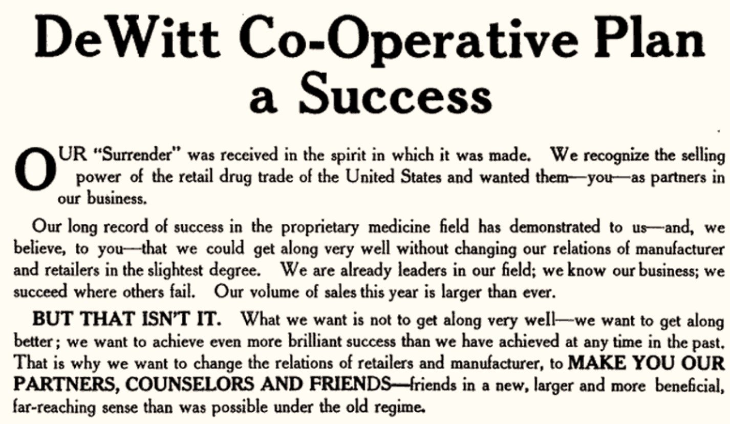 The company found its footing largely through clever marketing, and the druggist and pharmaceutical publications of the day were more than happy to legitimize it with full-page DeWitt & Co. advertisements—not just for the company’s products, but their unusual co-op shareholding plans/schemes, as well.