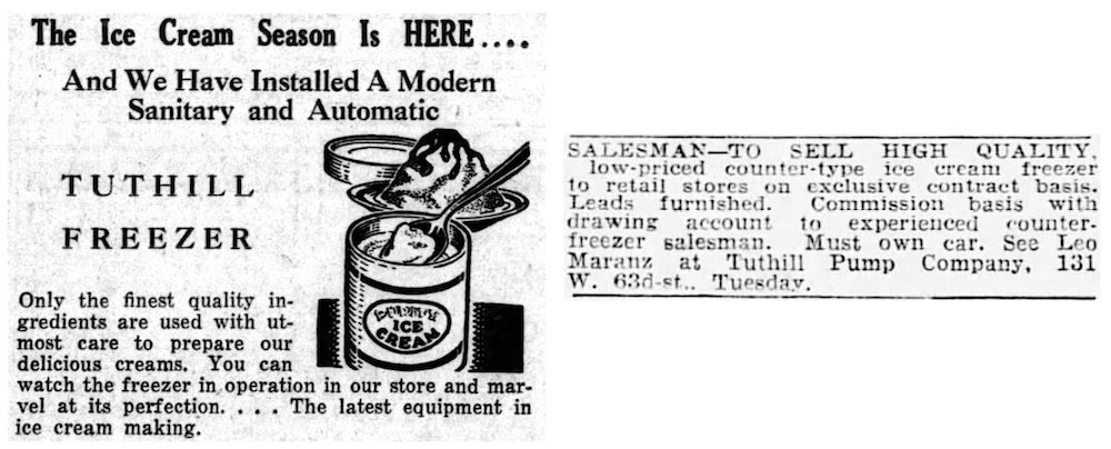[Left: 1935 ad for The Candy Shop in Newport News, VA, touting their new Tuthill Freezer. Right: 1935 ad for Tuthill Pump Co., seeking freezer salesmen. The contact was Leo Maranz.]