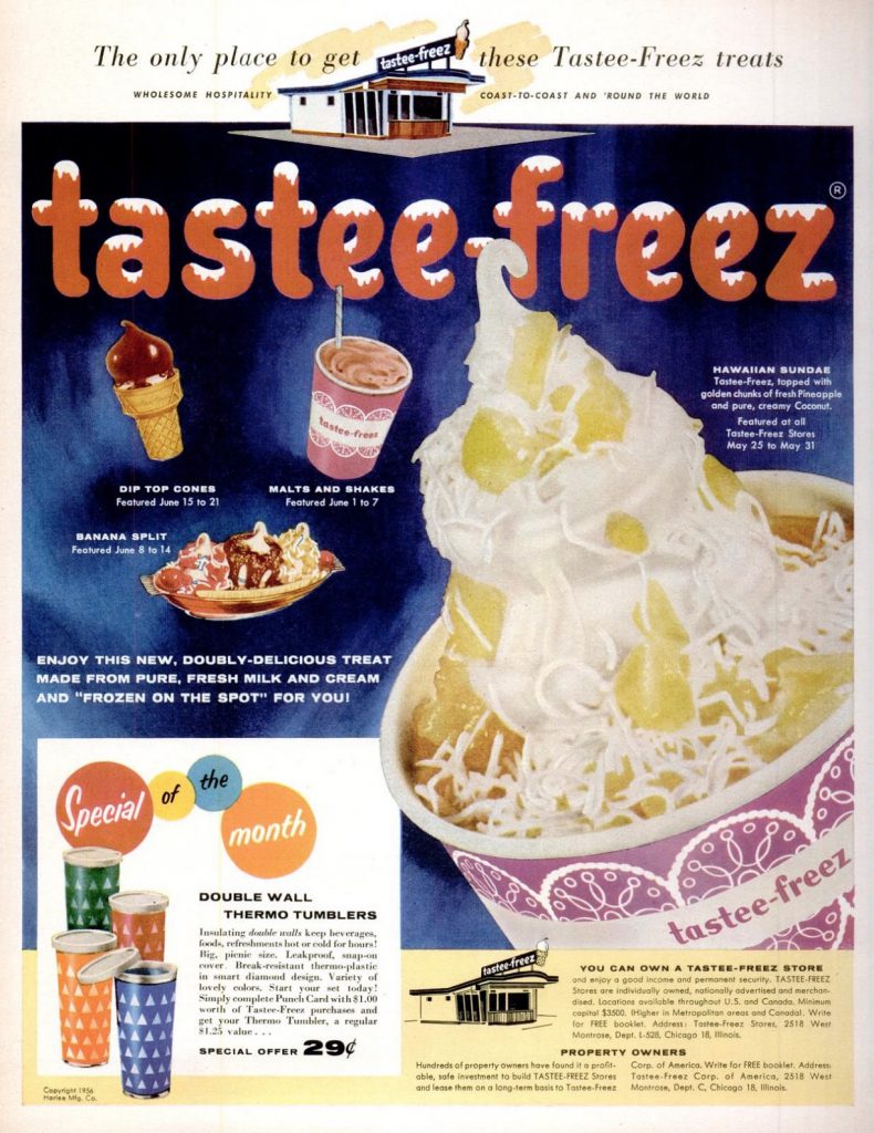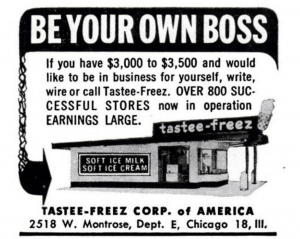“Be Your Own Boss,” read a 1954 ad. “If you have $3,000 to $3,500 and would like to be in business for yourself, write, wire or call Tastee-Freez. Over 800 successful stores now in operation. Earnings Large.”