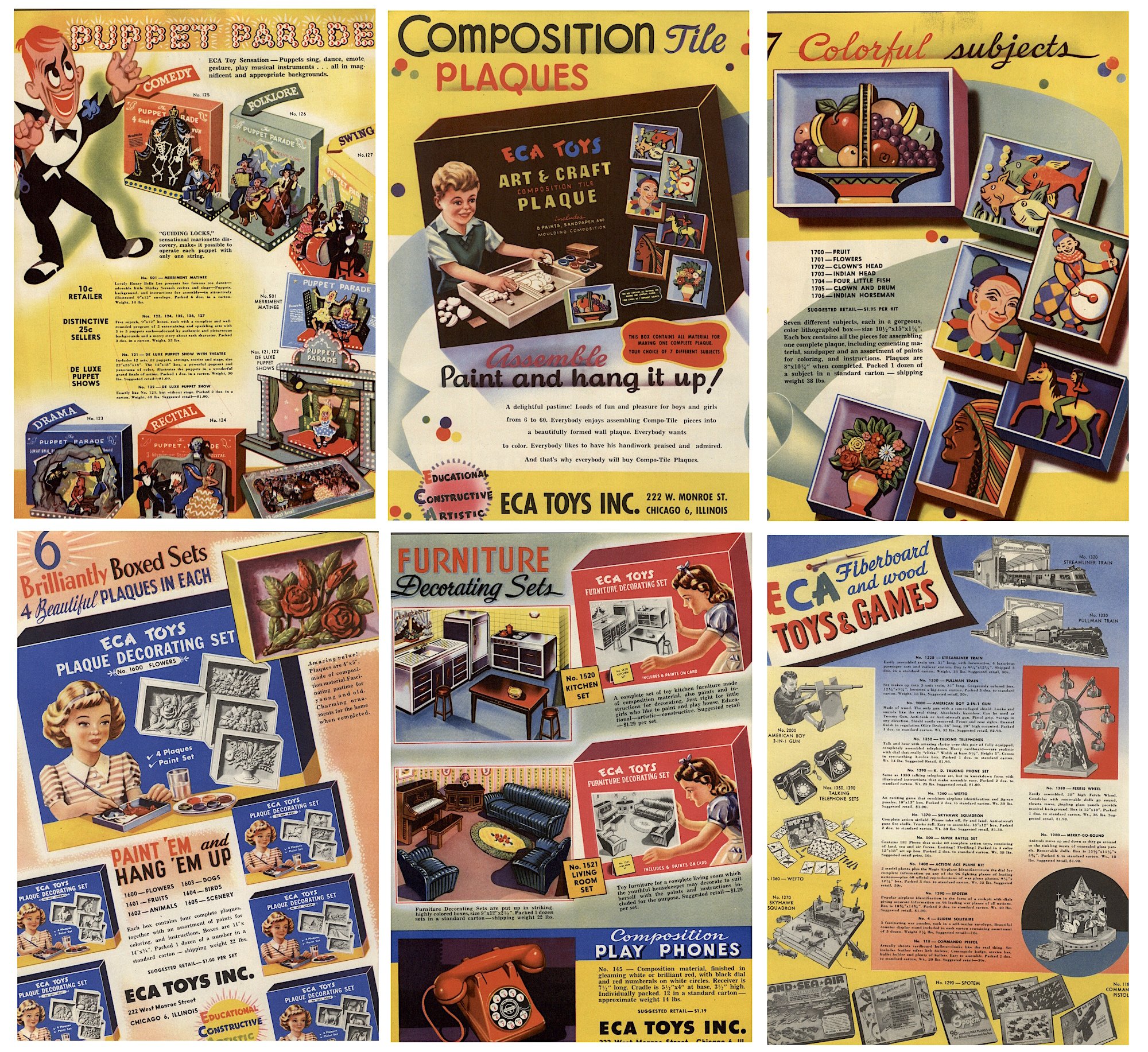 “Paint ‘Em—Hang ‘Em,” read a blurb in Billboard magazine in 1944. “Brilliantly boxed sets of plaques, together with an assortment of paints for coloring, are being offered by ECA Toys, Inc., Chicago. Educational, constructive, artistic—these toys promise a fascinating pastime for young and old alike. The plaques, coming four in a box, can be obtained in flower, fruits, animals, birds, and scenery designs, and they are said to be charming ornaments for the home when completed. ECA Toys, Inc. is featuring a complete line of other decorating sets, all claimed to be big features in art-craft attractions.”