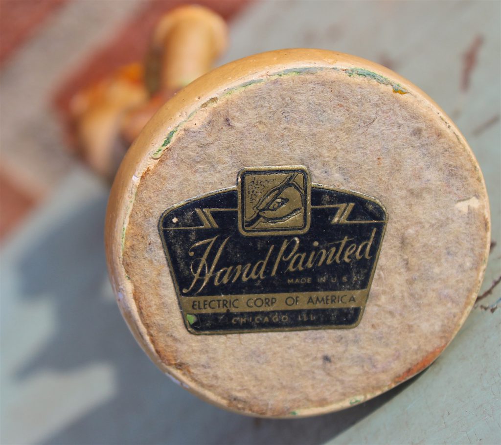 Dating from the early 1940s, our sleepy ceramic Little Leaguer here was produced a few years after the first Hummel figurines hit the U.S. market, making him a sort of hyper-Americanized, wartime knockoff of those popular German collectibles. The little guy has his own charm, I guess, but the odd part is the manufacturing label under his feet, which claims that the piece was “Hand Painted” in the U.S.A. (not, from the looks of it, by a professional) and distributed by the “Electric Corp. of America, Chicago, ILL.”