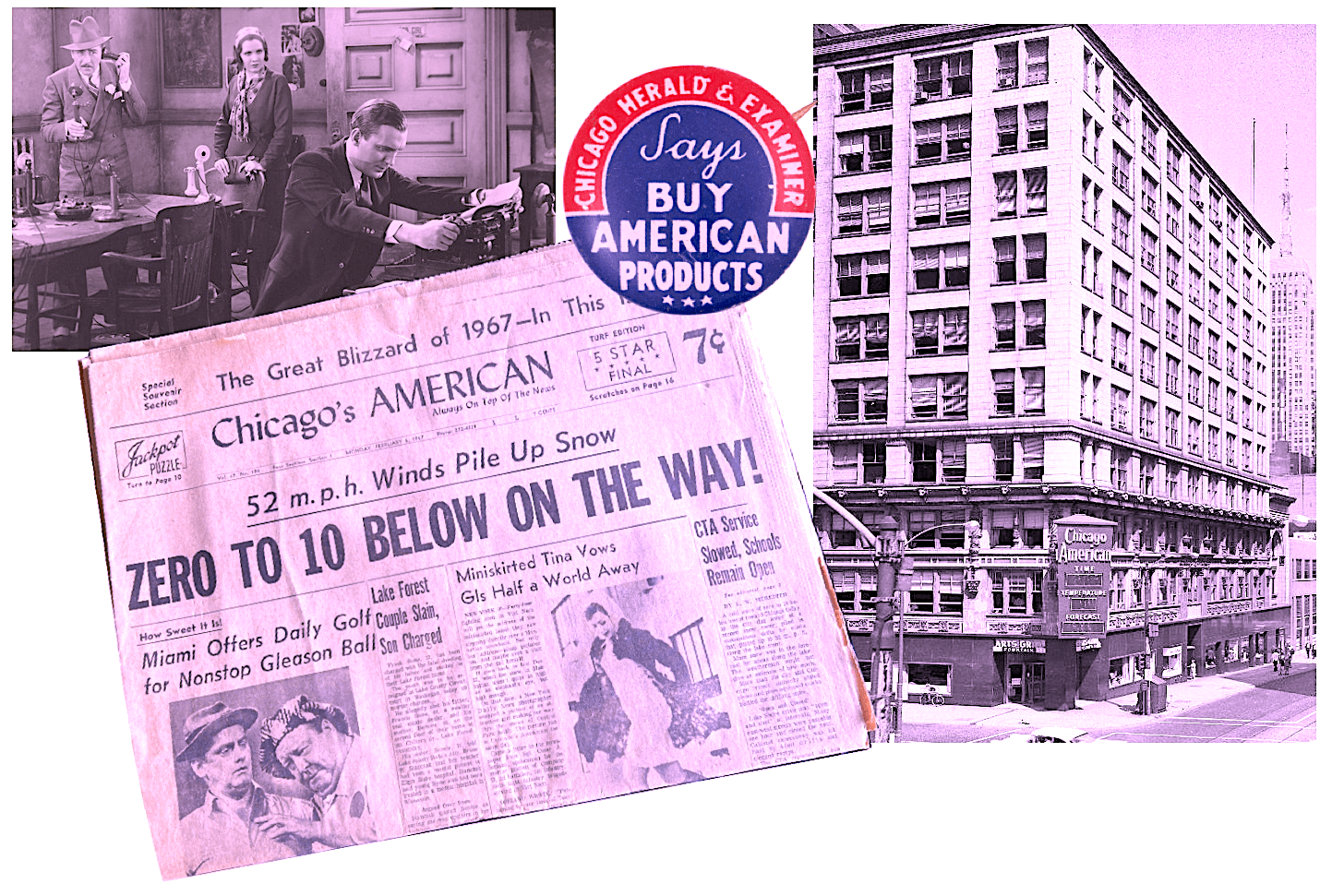 [From left to right: Still from 1931 film adaptation of “The Front Page”; 1967 issue of Chicago’s American, one of the Hearst papers for which Harry Romanoff worked; pinback for the Chicago Herald & Examiner, precursor to the American; and Romanoff’s home office at the Hearst Building, 326 W. Madison St., 1950s.]