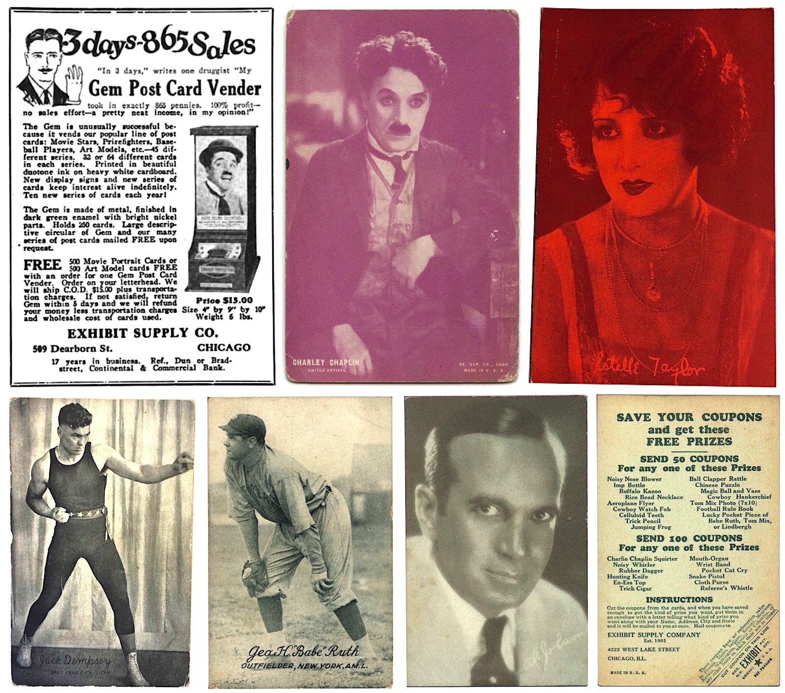 [Top Row: 1924 ad for Gem Post Card Vender, Exhibit cards for actors “Charley” Chaplin and Estelle Taylor. Bottom Row: Cards for 1920s icons Jack Dempsey, Babe Ruth, and Al Jolson, plus the back of Jolson’s card, promoting additional prizes available from Exhibit Supply.]