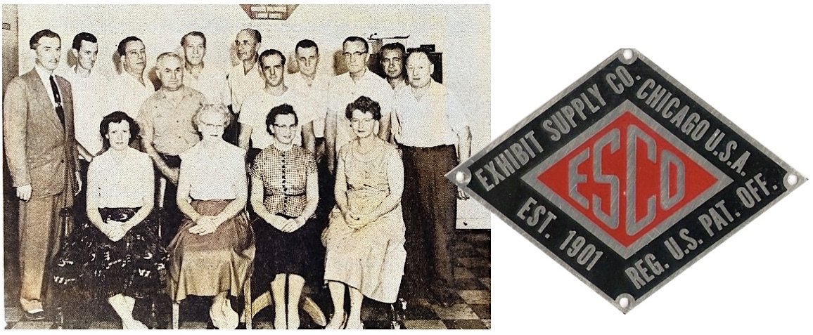 [15 of Exhibit Supply’s longest serving employees posed for the photo above in 1955. They are: Frank Mencuri (top row, far left), Patrick Moran, Chester “Chet” Gore (top row, third from left), Hugo Stube, Max Hofstetter, Lee Moss, Tony Covelli, Louis Johnson, Shorty Houser, Frank Cosenzo, Louis Russ, Margaret Romano, Margaret O’Brien, Marian Souhrada, and Florence Mullaney. Only a few of these people were still on board when Chet Gore moved the company to the building below in 1960]
