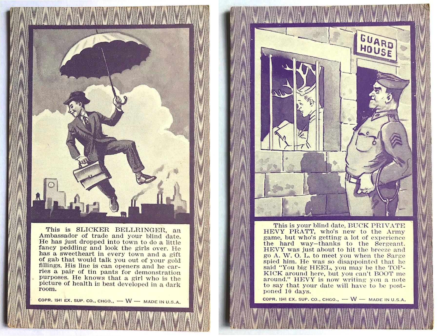 “This is Blackie Klink, your blind date,” reads one of the cards in our collection, featuring a Capone-esque fellow in a pinstripe suit and a fedora, “he’s a well known character . . . especially to the police. Blackie, a former gangster, has decided to go straight (providing it pays), and has traded in his gat for a halo. At one time Blackie opined ‘Ain’t no woman, ain’t to be had,’ but that was before he reformed. Blackie says that a girl only shows her true colors when she’s run out of rouge. Will you let Blackie take you for a ride?”