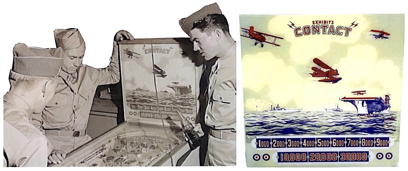 [Soldiers taking a break to play Exhibit’s “Contact” pinball game at an arcade in the early 1940s. Exhibit was starting to develop more pinball machines before the war shut down production in 1942]