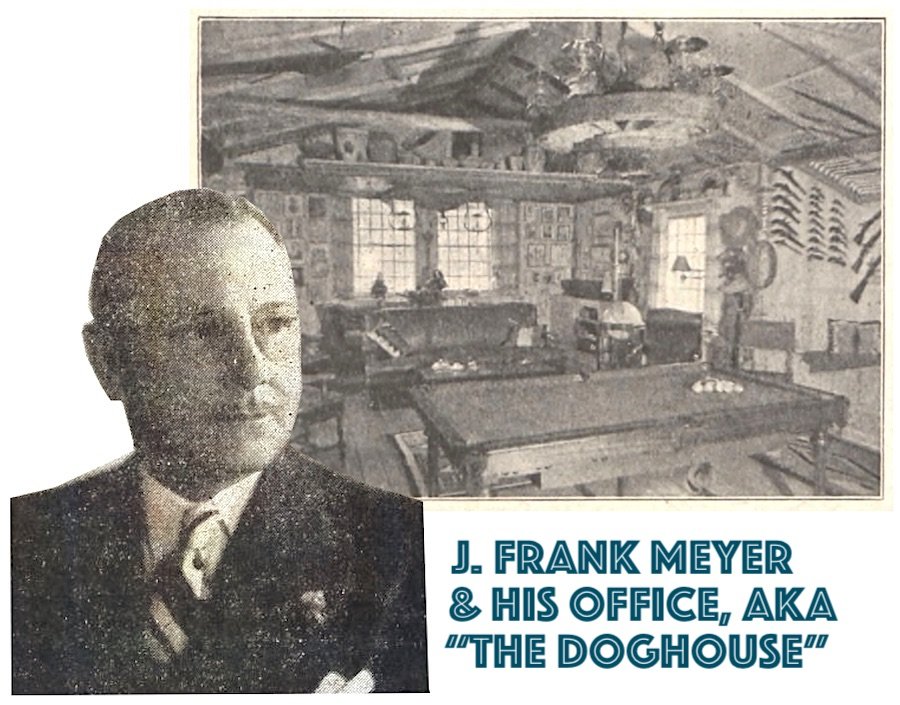 The same article notes the completion of J. Frank Meyer’s newly renovated office, which was famously known as the Den Room or The Doghouse. “This new departure in the way of private offices boasts natural wood panels all around, trophies of different kinds of game and fish upon the walls, Indian rugs upon the floor, large fireplace, and everything to make you think that you are in a hunting lodge up in the north woods.”