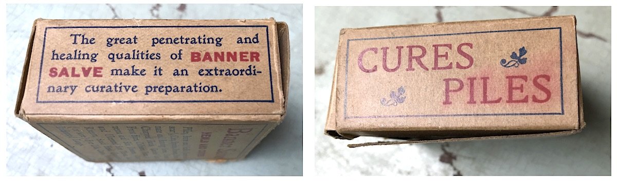 “Banner Salve is made from a prescription of an Eminent Skin Specialist,” claims the advertising sheet folded inside the packaging, “and is unexcelled for Cuts, Burns and Wounds of every nature. . . Running sores that have baffled the skill of physicians have been cured by Banner Salve.”