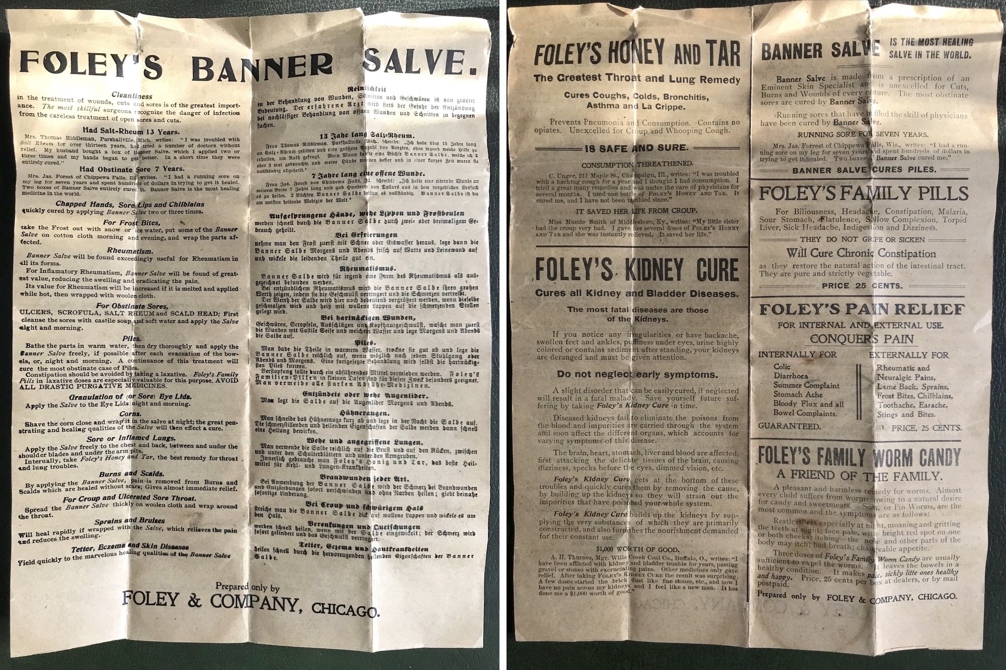“I had a running sore on my left leg for seven years,” a Mrs. Jas. Forrest of Chippewa Falls, Wisconsin, supposedly wrote to Foley & Co. “I spent hundreds of dollars in trying to get it healed. Two boxes of Banner Salve cured me!”