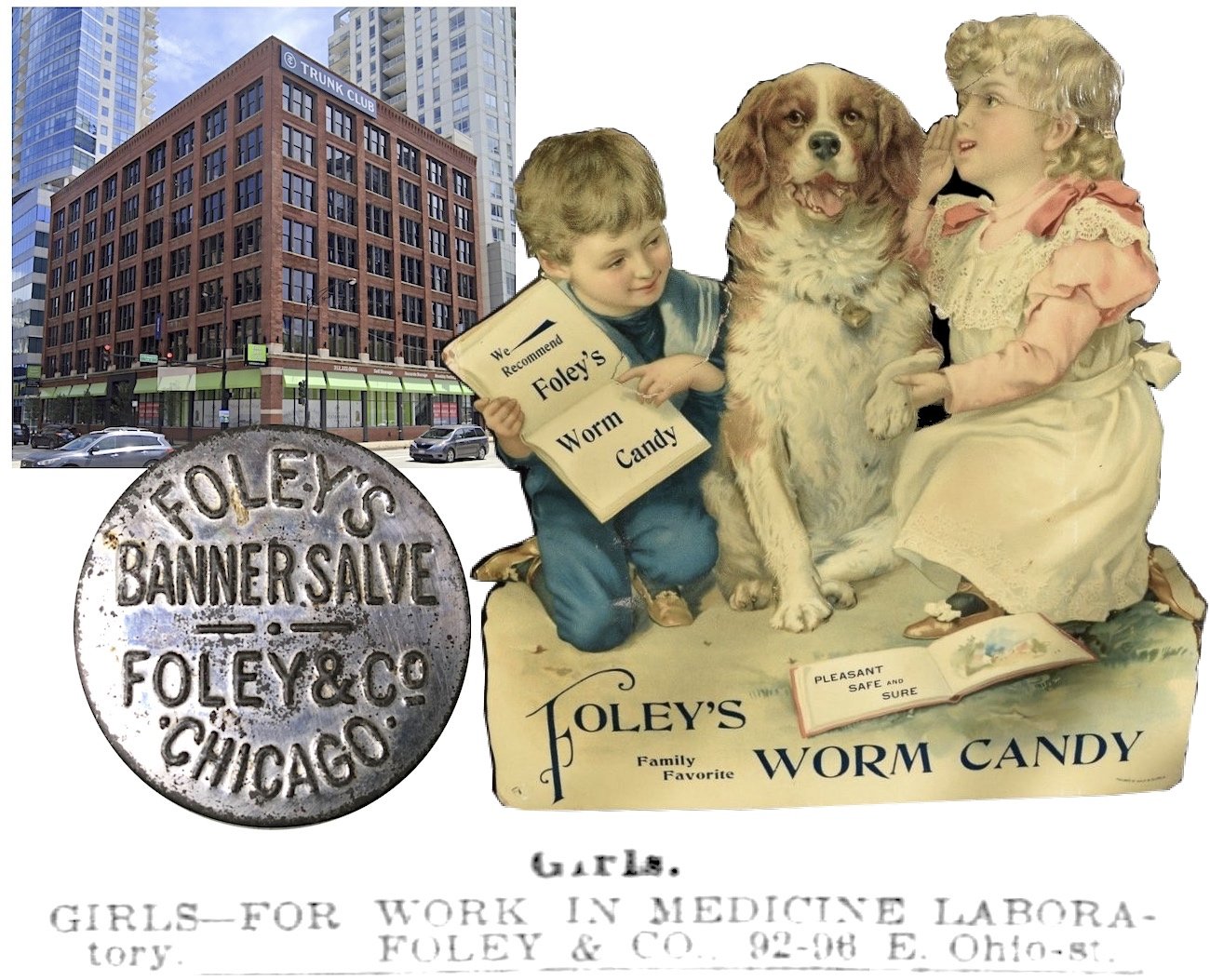 [Top Left: Building 319-333 W. Ohio Street, formerly known as 92-96 E. Ohio Street, where Foley & Co. occupied at least two floors during the 1900s. Right: A countertop ad for Foley’s Family Favorite Worm Candy (which was intended not as a dessert, but to treat children suffering from worms). Bottom: 1908 ad seeking girls to work in the Foley lab. Lower Left: Our museum’s tin of Banner Salve, circa 1900s.]