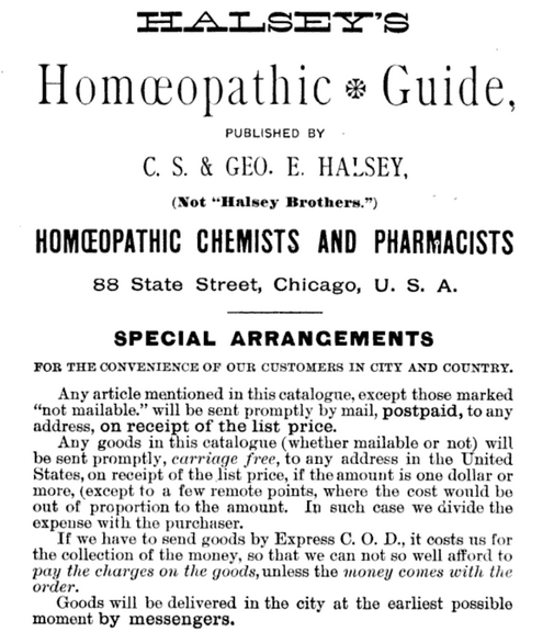 Now, certainly, some 19th century homeopathy ambassadors genuinely came to believe in the practice. Others were just hucksters out for a buck. Where each Halsey brother stood on this, who’s to say? But they certainly made a career of bottling, touting, selling, and defending homeopathic medicines. For their time, they were about as well known as a few druggists could get.