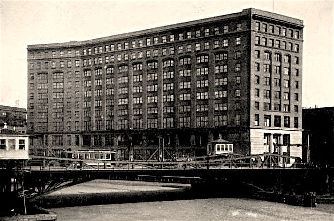 [The colossal HSB&Co building on North Water Street, opened in 1924, torn down in 1989]
