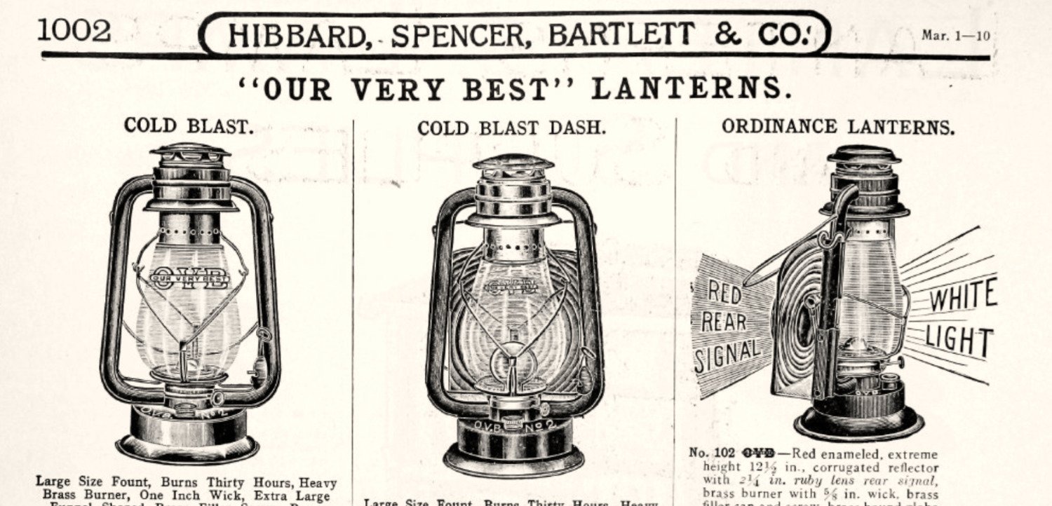 Like their contemporaries Sears-Roebuck and Montgomery Ward, Hibbard, Spencer, Bartlett & Co. was largely a distributor rather than a manufacturer. The 15″ barn lantern in our museum collection, for example, might have been made by the Embury MFG Company of New York, then branded with the O-V-B lettering and shipped in bulk to Chicago.