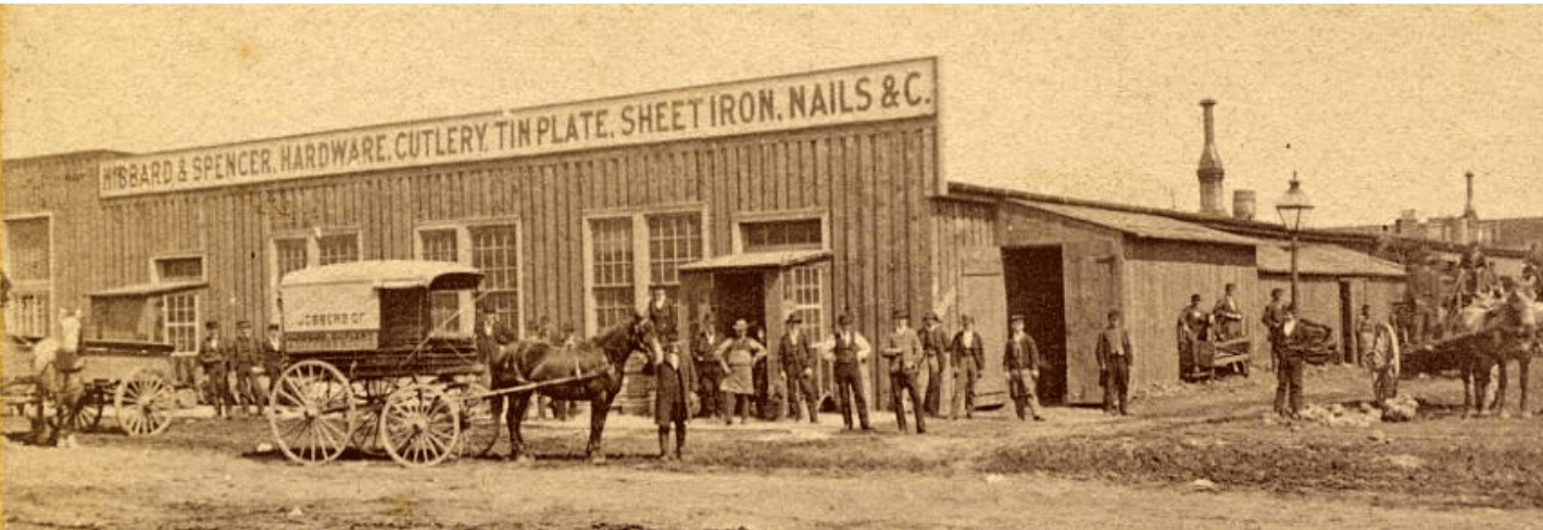 By the end of the Civil War, with hardware prices in a rough spot, Tuttle was out and Spencer was in, as the newly renamed Hibbard, Spencer & Co. moved into a big new warehouse at 92 Michigan Ave. Among their employees was a 21 year-old janitorial staffer named A.C. Bartlett, another ambitious kid from western New York.