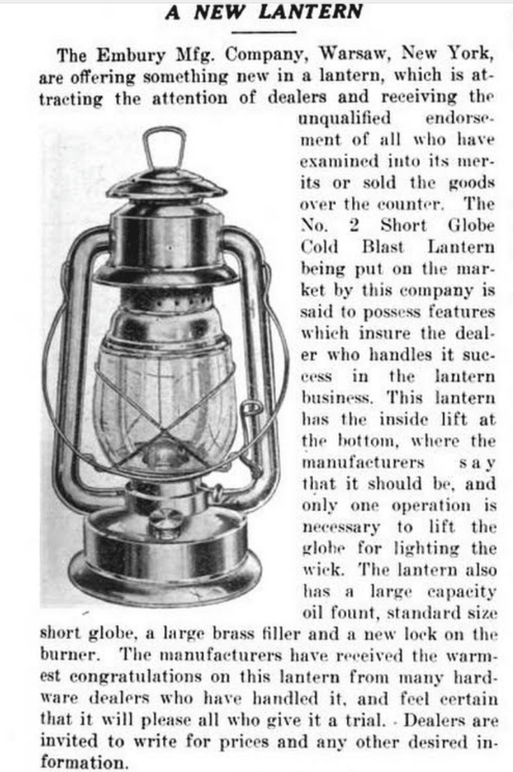 [A 1912 issue of the Hardware Reporter discusses the new Embury No. 2 Short Globe Cold Blast Lantern, a mighty similar design to our No. 2 OVB Lantern]