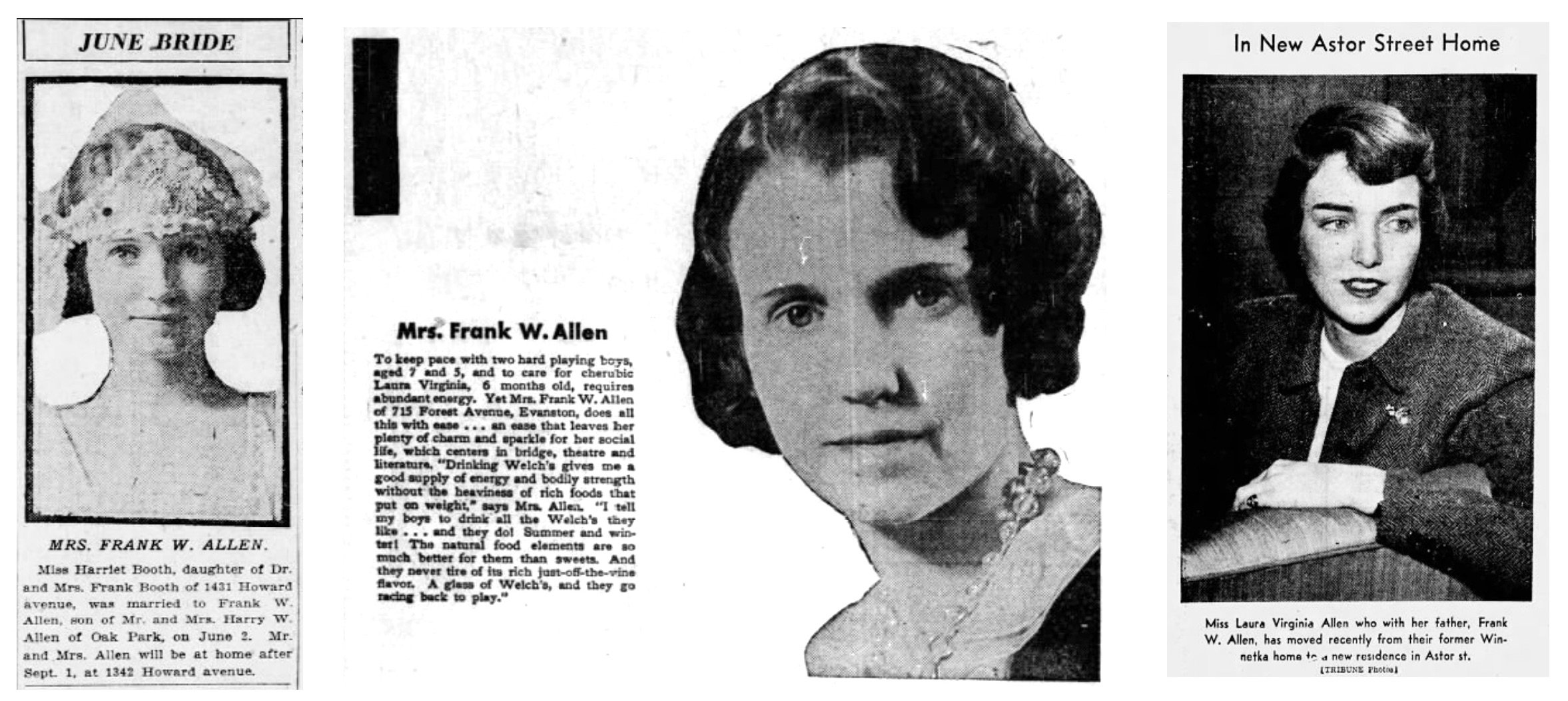 [The women in Frank W. Allen’s life: His wife Harriet, seen in a newspaper announcement of their wedding in 1921 (left) and in a testimonial for Welch’s Grape Juice in 1931 (center), and daughter Laura Virginia (right) in 1951. Harriet died in 1947 at just 49 years of age; Laura lived to be 71 (1930-2001)]