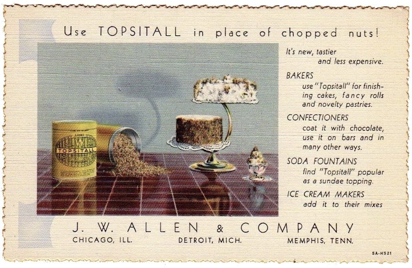 [Postcard advertisement for J. W. Allen’s “TOPSITALL” cake and ice cream topping, circa 1940. The same product was originally marketed as “Kripsy Krumbles”]