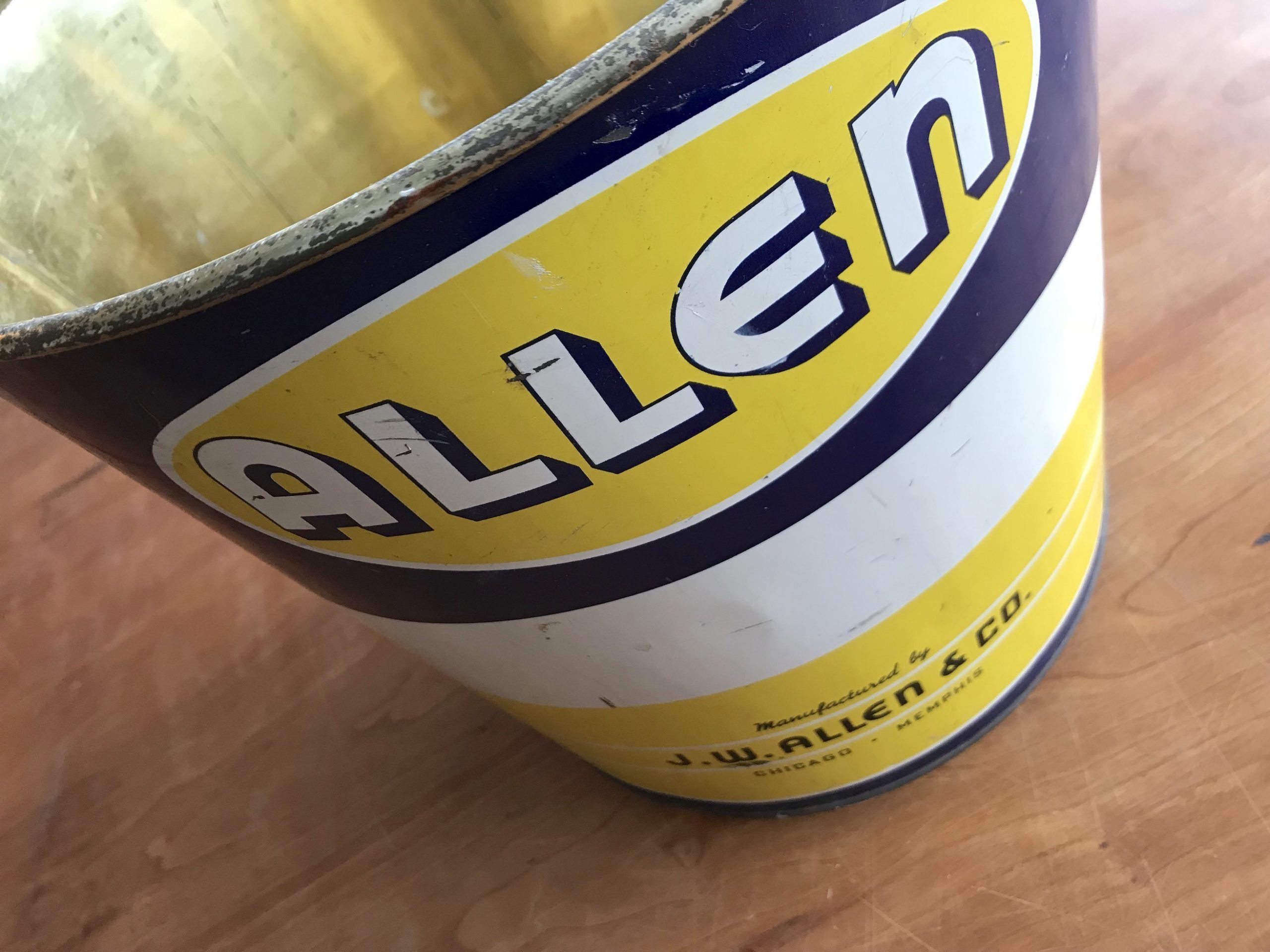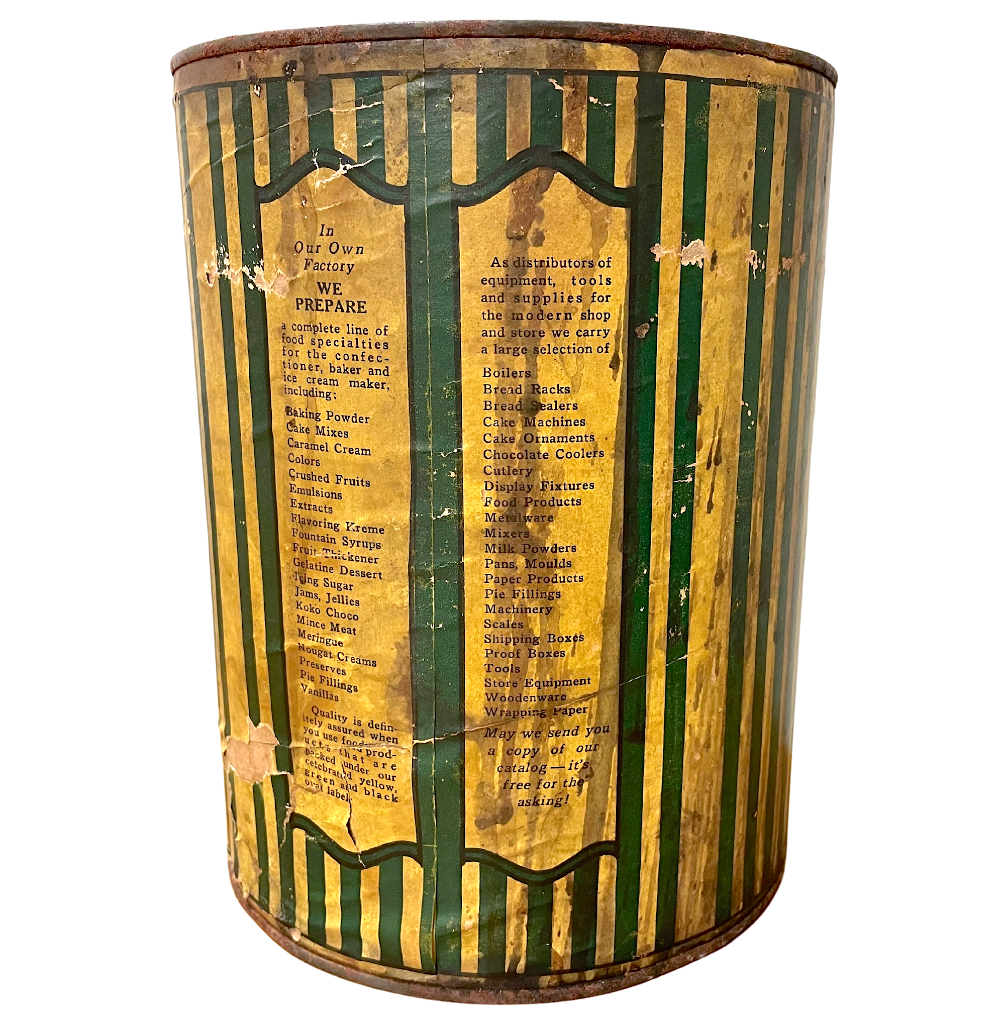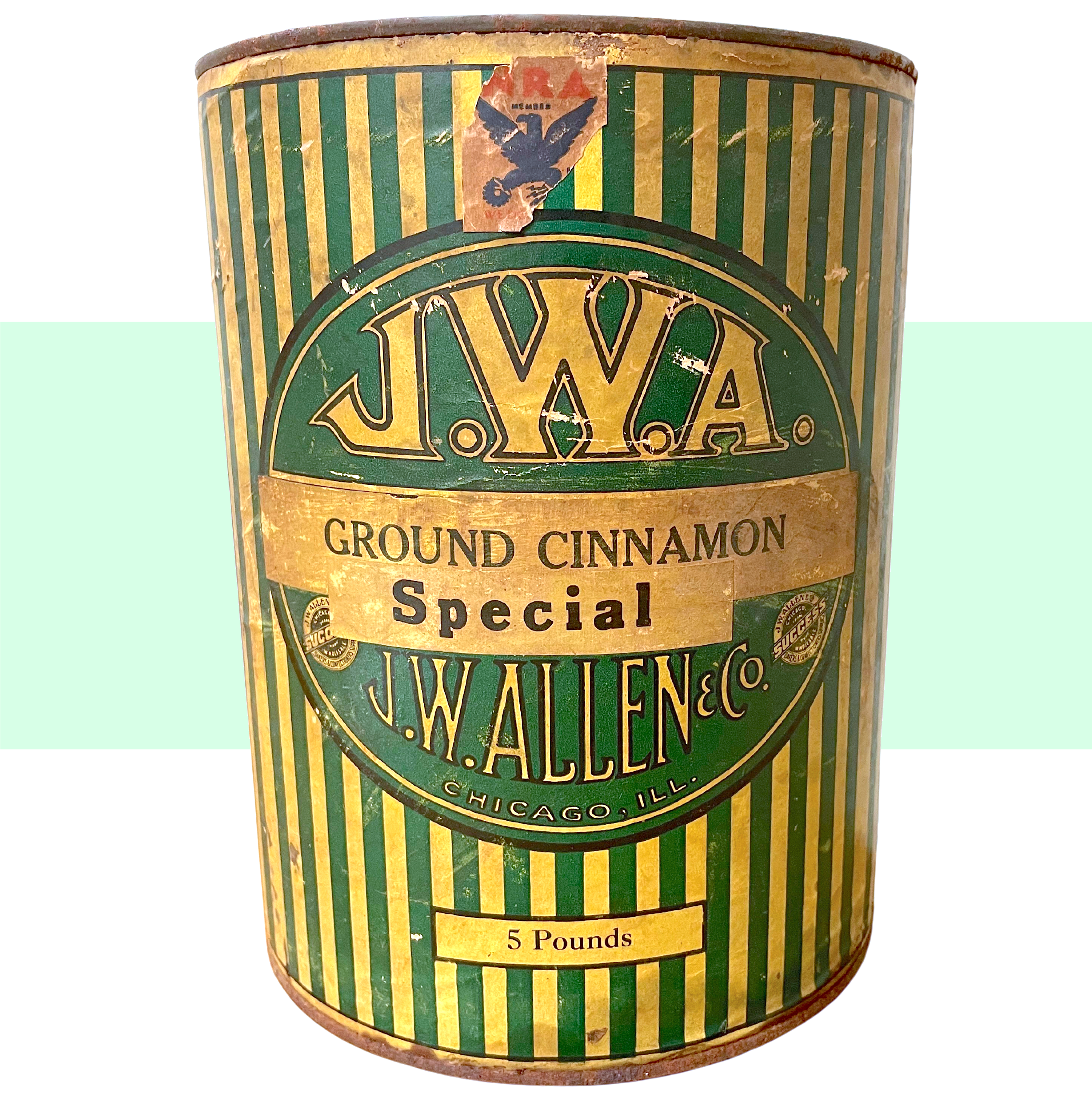The name J. W. Allen has been associated with baked goods for nearly 140 years—and yet you’ve probably never knowingly eaten a single one of their cookies, cupcakes, or casseroles. Unlike the ubiquitous Betty Crocker or Pillsbury Dough Boy, Allen didn’t really cater to grandma’s kitchen cabinet of branded Americana. This Chicago-based family business was focused more on the professional ranks; selling wholesale supplies and bulk ingredients to bakeries, often packaged in big ugly feed bags or galvanized metal buckets. Occasionally, they also sent out snazzier candy-striped cylinders like the 5LB ground cinnamon container in our museum collection (the National Recovery Administration tag attached at the top indicates this particular artifact dates back to the 1930s).