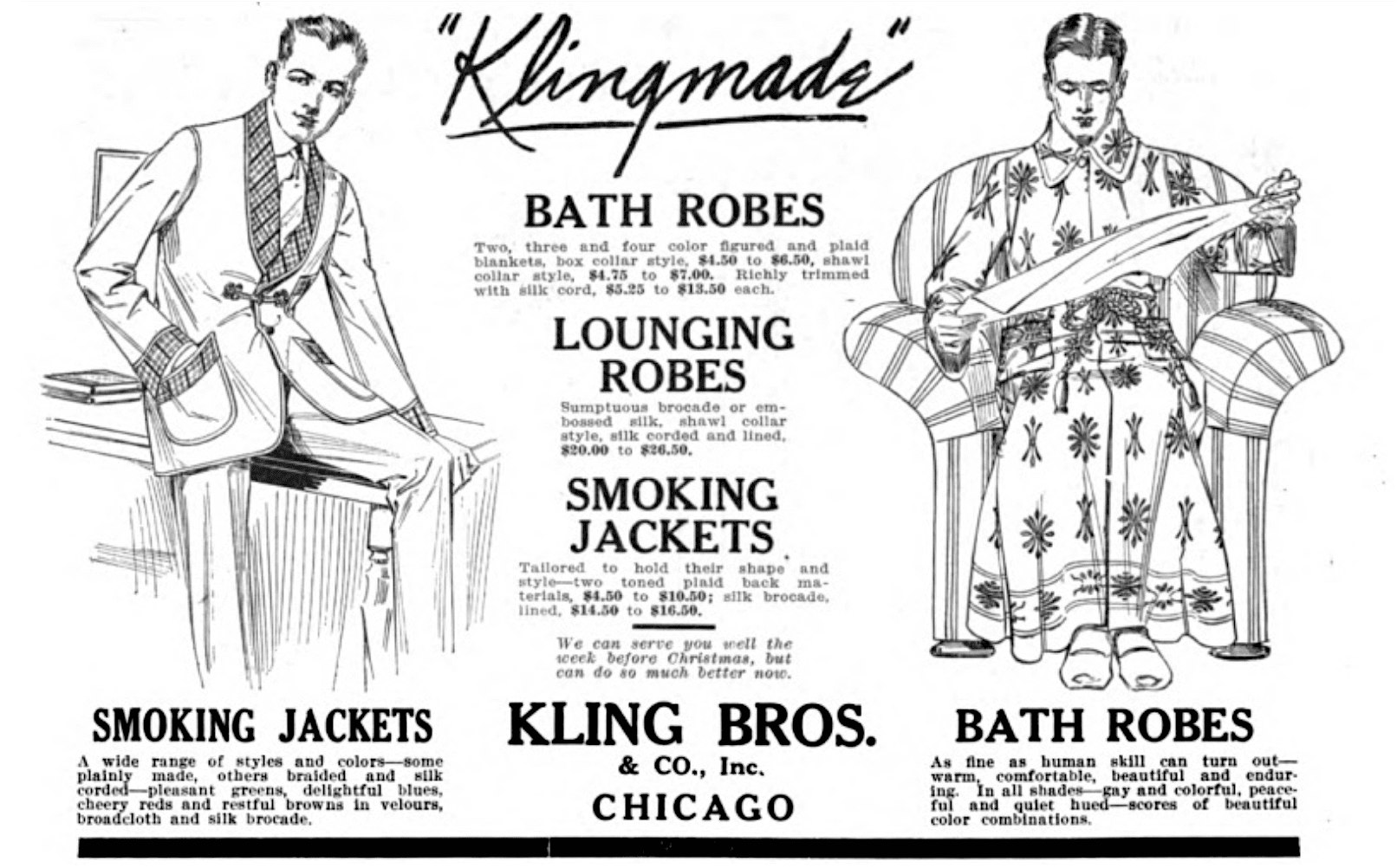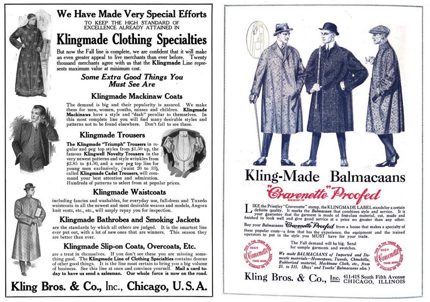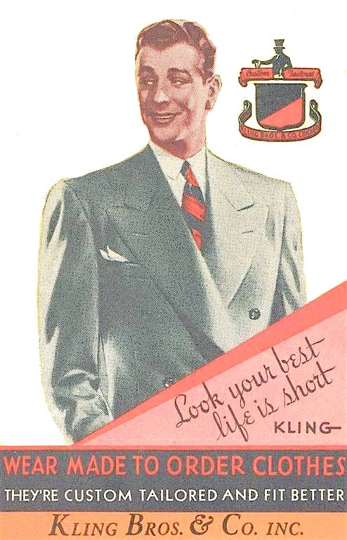 “Garments that combine character and charm with lines that are clean cut, comfortable, and correct. . . . Are you one of the ten thousand dealers who know the immeasurable satisfaction to be found in KLING-MADE clothing specialties?”—1920 ad for Kling Bros. & Co.