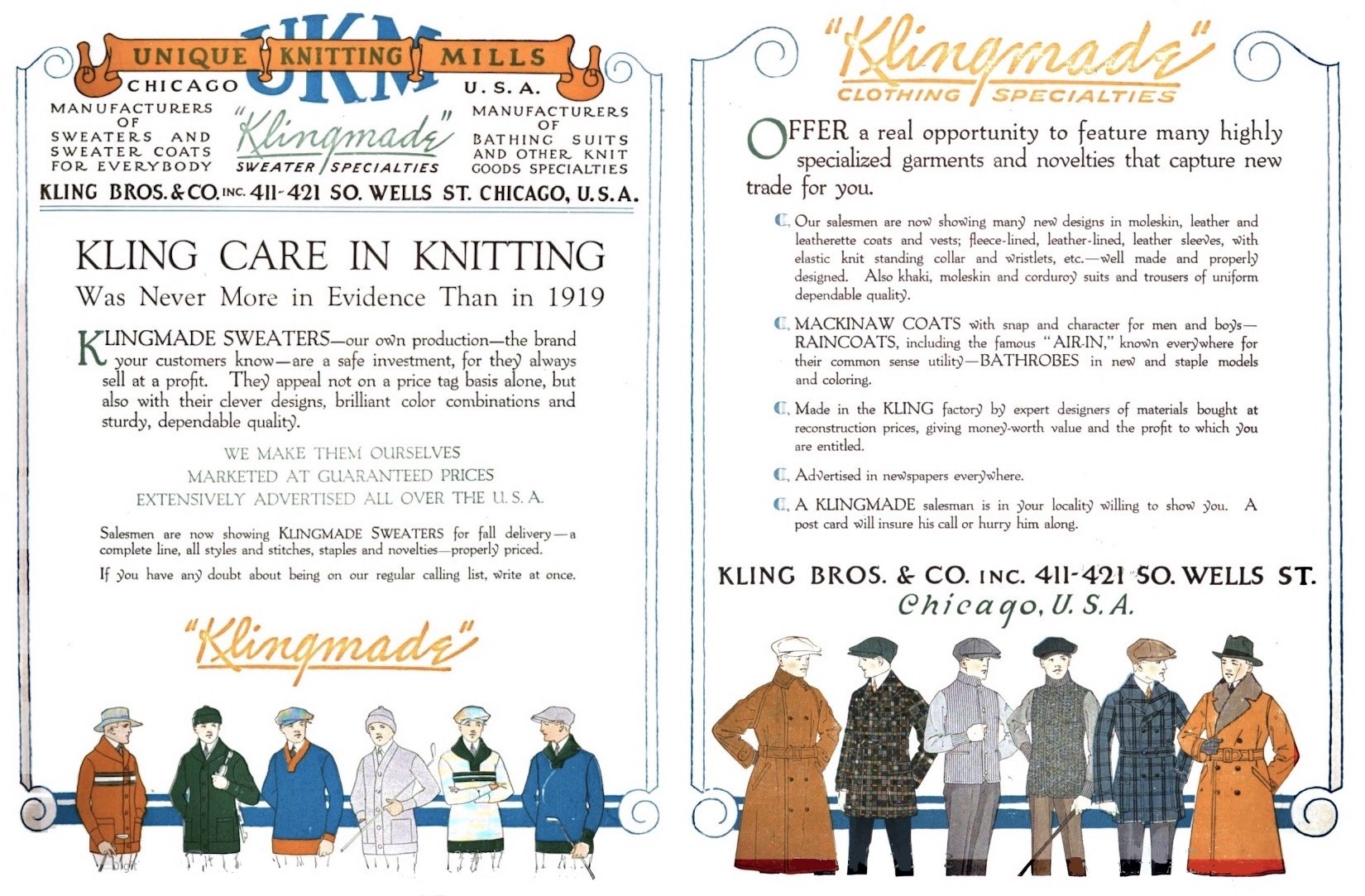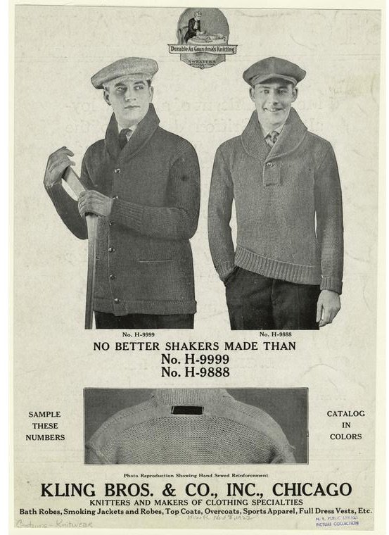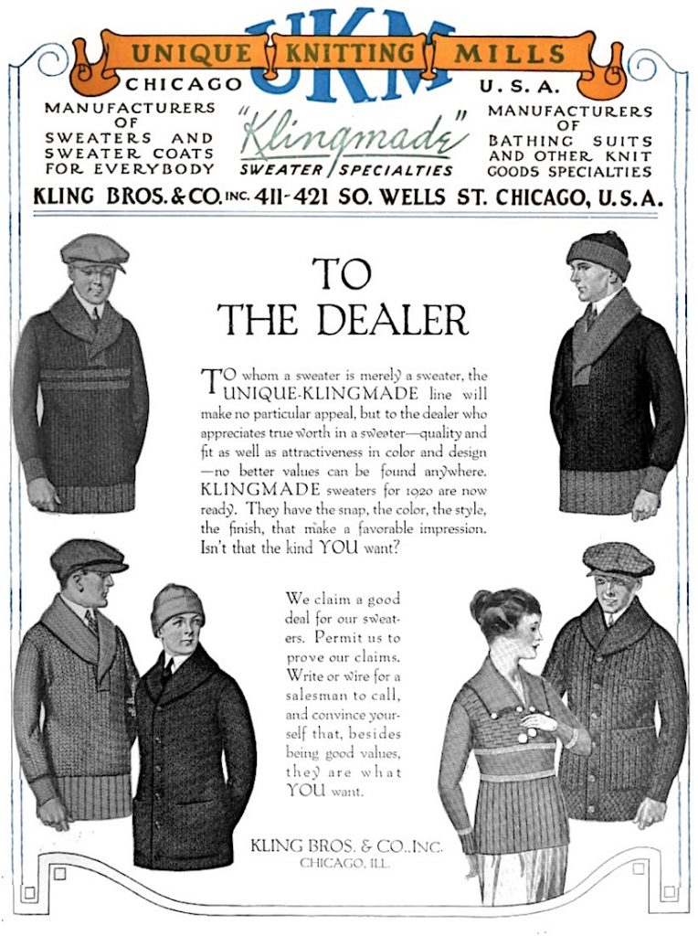 “Klingmade Sweaters—our own production—the brand your customers know—are a safe investment, for they always sell at a profit,” read a Kling Bros. ad in a 1919 issue of The Haberdasher. “They appeal not on a price tag basis alone, but also with their clever designs, brilliant color combinations and sturdy, dependable quality.”