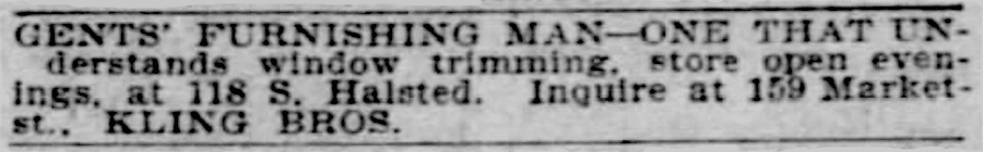 By 1902, Kling Bros. & Co. had 50 employees—39 of them women—working at its main plant at 159 Market Street (a road later erased by Wacker Drive). They then took over the former headquarters of another wholesale tailor, Lamm & Co., at 282 Fifth Ave., in 1904, and by 1906, had a whole network of manufacturing facilities operating under the Kling banner: 45 workers at 899 Milwaukee Ave, 25 at 328 Ohio Street, and 90 more at 862 N. Robey Street.