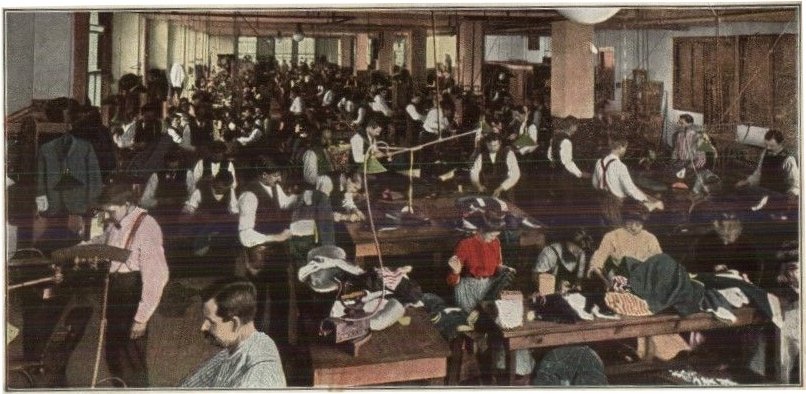 [Tailors at work, circa 1910, inside the coat shop of a Kling Bros. competitor, Ed V. Price & Co.; a company Leopold Kling would later take over]