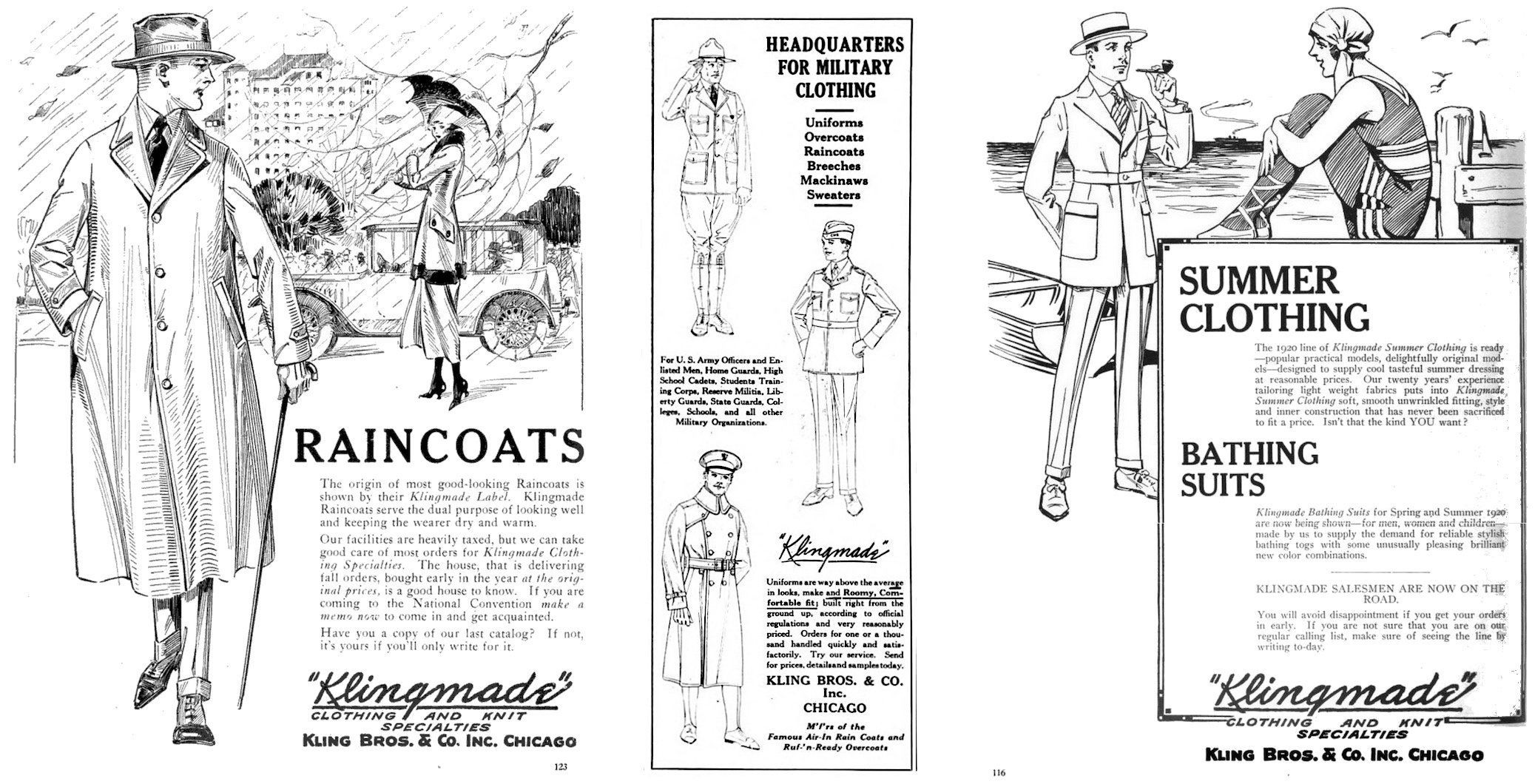 During the labor clashes and the horrific world war going on concurrently, Kling Bros. had still managed to expand not only its sales territory, but its range of products. They promoted themselves as the “headquarters for military clothing” during World War I (although it’s unclear if they actually had government contracts to clothe the enlisted men overseas), and made a wide range of uniforms with a “roomy, comfortable fit.” Meanwhile, for the everyday working man, the Kling “Air-In Raincoat” and “Ruf’-n-Ready Overcoat” handled the rough weather, while the “Airy-Lite” line of suits kept things breezy in the summer.