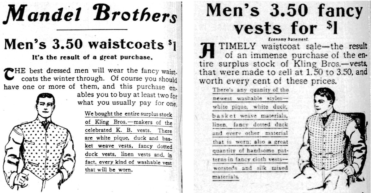 [Above: Kling Bros. classified ad from 1902, noting the storefront on Halsted and factory on Market Street. Below: 1903 advertisements for Chicago’s Mandel Brothers department store (State & Madison), featuring “fancy vests” from the “surplus stock of Kling Bros.—makers of the celebrated K.B. vests.”]